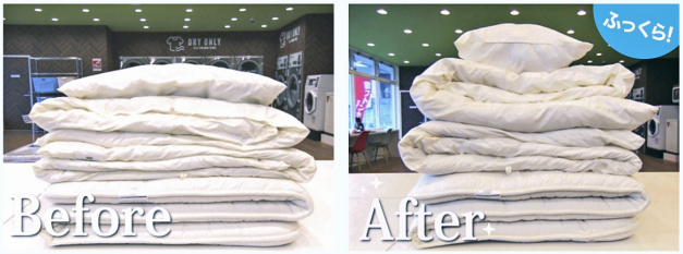 1つ目は、中わたの中⼼まで浸透・洗浄する洗剤と、独⾃の技術・システムにより、従来の技術では洗うことの難しかった中綿の中⼼部までも、しっかり洗うことができること。仕上がりもふっくらだ。