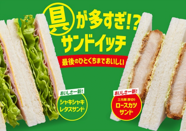価格は「シャキシャキレタスサンド」が276円(税抜き、以下同じ)、「三元豚 厚切りロースカツサンド」が369円。