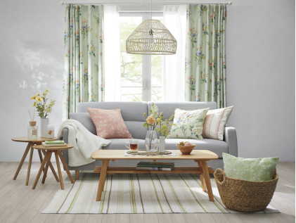 部屋のなかで広い⾯積を占めるカーテンやラグ、アクセントとなるクッションカバーを変えると、⼀気に春らしさが広がる。照明は、軽やかであたたかみのある⾃然素材をセレクトした。
