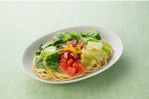 「シャキシャキ野菜とベーコンの旨塩パスタ」は、ロメインレタス、水菜、キャベツ、トマトの4種類の茨城県産野菜を使用している。ロメインレタスと水菜、トマトは生のまま盛り付け、キャベツのみ加熱することで、野菜毎に異なる食感を味わえる。刻み柚子をのせることで、爽やかな香りも楽しめる。価格は490円。
