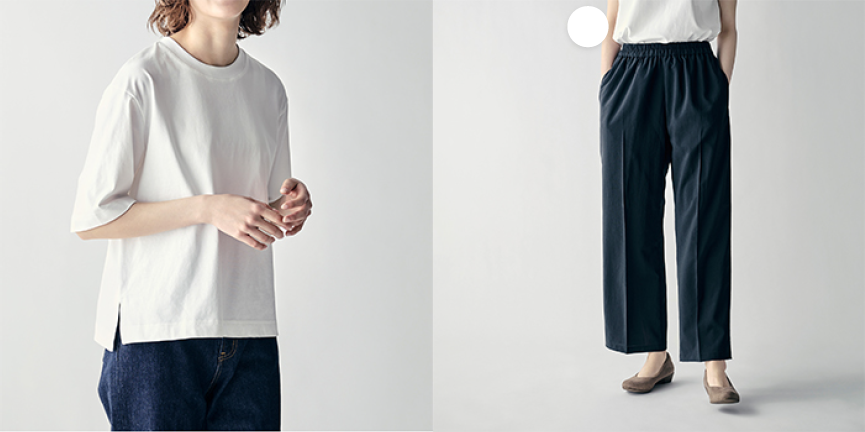 「風を通すシリーズ」では、生地に工夫を施した風通しの良いアイテムを展開する。「風を通すストレッチサッカー」は、生地に極小の通気孔をつくることで通気性があり、湿気の多い季節に蒸れにくい生地だ。また、生地表面に凹凸があるので肌触りはさらっとしているが、ゆったりとしたシルエットにすることでさらに風通しがよくなった。婦人アイテムでは、強撚糸で風通しが良くシャリ感のある生地の「風を通すワイドパンツ」「風を通すテーパードパンツ」を展開する。ウエストはゴム仕様でゆったりしているが、センタープレスが入っているので、オフィスカジュアルとしても着用できる。