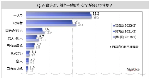 一つは、半年に1回以上百貨店を利用する人は4割強、月1回以上は2割弱。利用経験者のうち、百貨店に「一人」で行く人は約55%。「配偶者」が4割弱、「自分の子ども」が1割強だったこと。