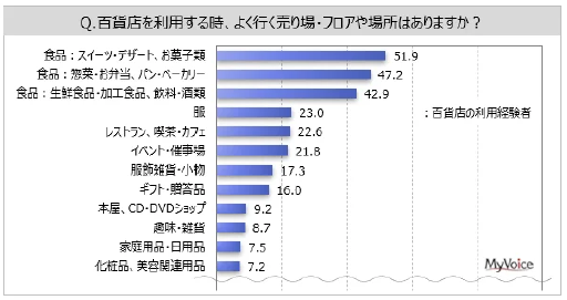 もう一つは、百貨店の利用経験者がよく行く売り場・場所は、「スイーツ・デザート、お菓子類」が5割強、「惣菜・弁当、パン・ベーカリー」「生鮮食品・加工食品、飲料・酒類」が各40%台だったこと。