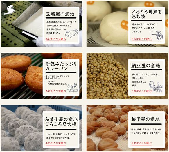 「いい商品には、物語がある。」がブランドコンセプト。素材、製法、職人技といったつくり手の想いやこだわりを「ものがたり」として表現する。顧客は商品に記された二次元バーコードでこの「ものがたり」を見ることができる。店頭やホームページでも商品の詳細を伝える。
