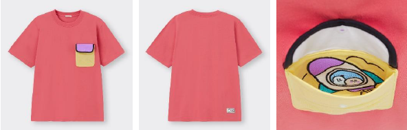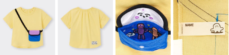 バックネックのゴム仕様とギャザーによって頭が楽に入れられるカンタン T。腕や手を通しやすいよう裾に段差を付け、バストと袖幅は大きめに設定した。ポケットの中には、おなじみのキャラクターたちが隠れている。大人のポケ付き T とデザインとカラー展開が同じなので、親子でのおそろいコーデも楽しめる。オフホワイト、レッド、イエローの3色、サイズは80cm、90㎝、100㎝、価格は1490円。