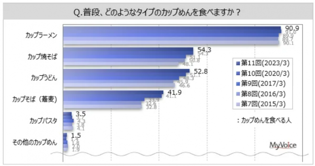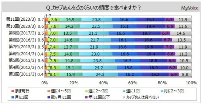 マイボイスコム(株)(東京都千代田区、高井和久社長)が、11回目となる「カップめん」に関するインターネット調査を実施した。
