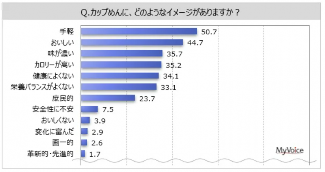もう一つは、カップめんのイメージが「手軽」が5割強、「おいしい」が約45%。次いで「味が濃い」「カロリーが高い」「健康によくない」「栄養バランスがよくない」が各30%台だったこと。「栄養バランスがよくない」は、女性や若年層で比率が高かった。