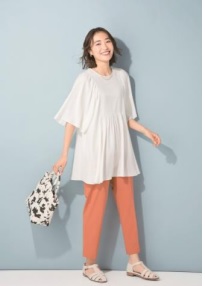 「オトナミエ チュニックブラウス」3900円、「美脚叶うドライテーパードパンツ」3300円。