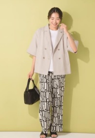 「サマミエ リラックスジャケット」5900円、「ヘビロテ ムジTシャツ」2300円、「ビーイージー プリントパンツ」4500円。