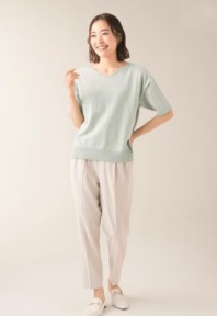「サマミエ サラサラVネックプルオーバー」3900円、「美脚叶うドライテーパードパンツ」3300円。