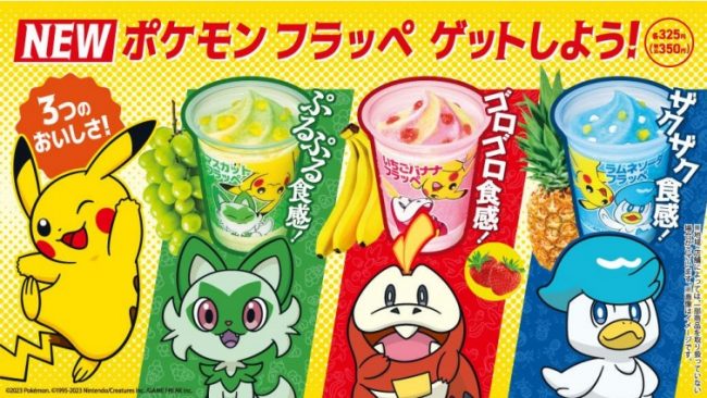 くさねこポケモン「ニャオハ」をイメージした「マスカットフラッペ」には、「ぷるぷる」とした食感のマスカット味のゼリー、ほのおワニポケモン「ホゲータ」をイメージした「いちごバナナフラッペ」には、「ゴロゴロ」とした食感のいちご果肉、こがもポケモン「クワッス」をイメージした「ラムネソーダフラッペ」には、「ザクザク」とした食感の大粒のラムネとパイン果肉が入っている。どのフレーバーにも、「ピカチュウ」をイメージした黄色い食べ物が入っているのもポイントだ。