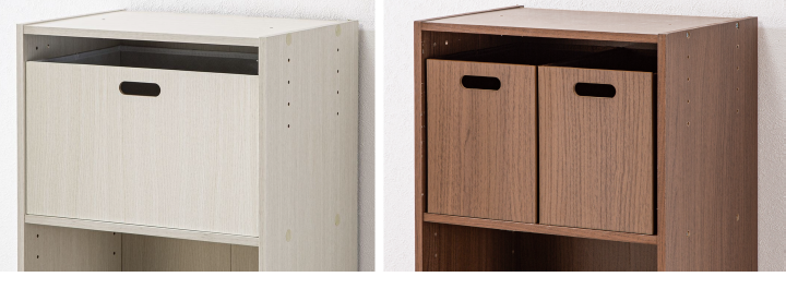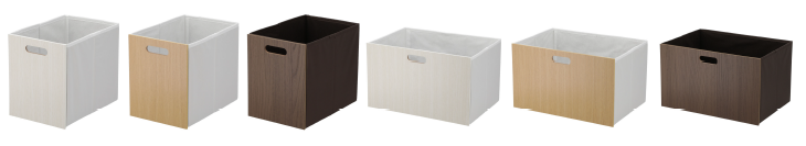 素材は繊維板、不織布、ペーパーの3種類で、カラーはホワイトウォッシュ、ライトブラウン、ミドルブラウンの3色。たて型ハーフ(幅18×奥⾏27.6×⾼さ23.1㎝)は799円(税込み、以下同じ)、レギュラー(幅39×奥⾏27.6×⾼さ23.1㎝)は999円。