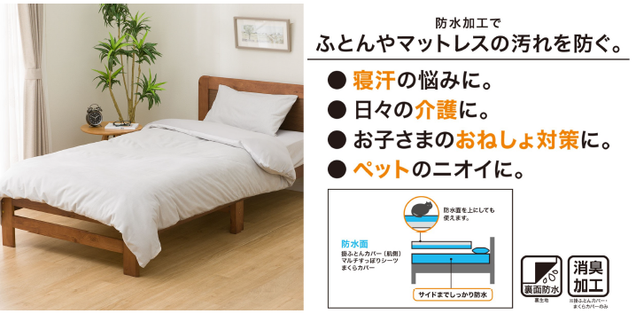 掛け布団カバーに防⽔機能がついていれば、寝汗、子どもやペットのおねしょなどが浸透することによる寝具への汚れを防ぐことができ、洗濯の回数を減らすことができる。⾼齢化が進み、家での介護を希望する人が増えてきているなか、⽇々の介護にも役⽴つ。掛け布団カバーの他、防⽔加⼯を施した枕カバー、マットレス・敷ふとん兼⽤シーツも用意している。カラーはグレー1色で、価格はシングルサイズ3490円(税込み、以下同じ)、セミダブルサイズ3990円、ダブルサイズ4490円。