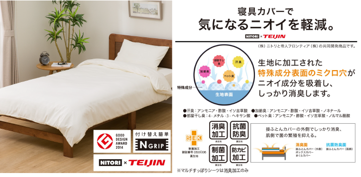 ⽣地に加⼯された特殊成分の表⾯にあるミクロの⽳がニオイを吸着する仕組みで、⽣活臭や⼈から出るニオイをしっかり吸収する。主にペット臭や汗のニオイ、加齢臭や部屋⼲し臭に効果を発揮する。外部試験機関で⾏われたそれぞれの臭気成分が6時間以内で90%以上減少しているという基準に合格し、洗濯10回後でも基準をクリアしている。カラーはアイボリー・ブルー・グレーの3色で、価格はシングルサイズ3990円、セミダブル サイズ4990円、ダブルサイズ5990円。