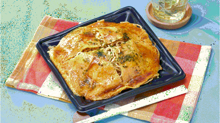 広島お好み焼の名店「ちんちくりん」監修のお好み焼。ガーリックとイカ風味天かすで味付けしたキャベツを蒸し焼きにし、もやし、豚肉、そば、卵を重ね焼き上げた。お好みソースとあおさがかかっており、マヨネーズが別添されている。価格は550円。