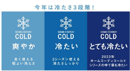 コールドシリーズはイオンが企画・開発した接触冷感素材を使用した商品。今年は敷パッドや肌掛けふとん、キルトラグ、ペットベッドなど132品目を取り揃える。冷たさの違いによってクール(爽やか)、コールド(冷たい)、アイスコールド(とても冷たい)の3段階に分けたことで、好みの冷たさや機能を選べる。