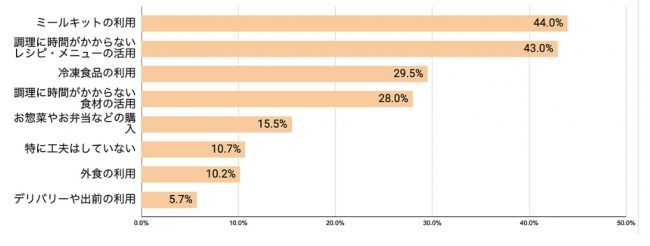 また”減った時間でどのように食事の準備を工夫しているか”については、回答者全体の約4割が「ミールキットの利用」「調理に時間がかからないレシピやメニューの活用」、回答者全体の約3割が「冷凍食品の活用」「調理に時間がかからない食材の活用」と回答している。