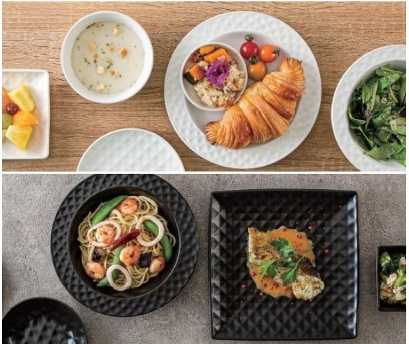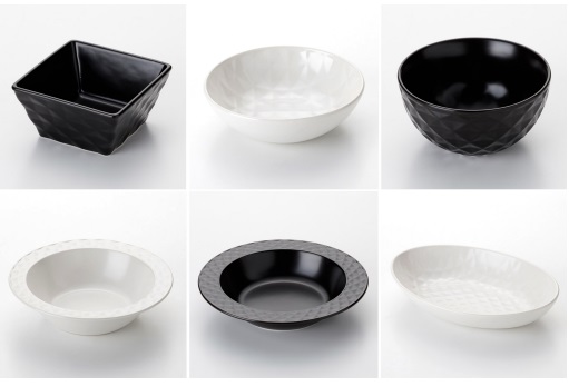 さりげないダイヤ柄と、⽩⿊マット釉薬仕上げで艶のないマットな質感が特徴だ。洋⾷、和⾷どちらにも使える。男⼥問わず⼈気カラーの⽩⾊と⿊⾊を揃える。無彩⾊の⽩や⿊が、それぞれの⾷材の⾊を際⽴たせ、料理を引き⽴てる。