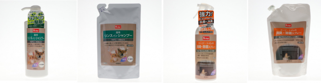その他、ペットケア関連商品として、新たに「薬用リンスインシャンプー 600ml」(798円)、「同詰替え用430ml」(598円)、「サークル・トイレの消臭・除菌スプレー 310ml」(398円)、「同詰替え用470ml」(398円)、「ペット用具のお掃除スプレー500ml」(398円)、「同詰替え用820ml」(498円)などをラインアップする。