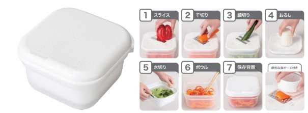 日々の料理では、キッチンツールを揃えると便利な⼀⽅で、ツールごとにサイズも形もバラバラのため収納スペースや整理に負担を感じる声に対応した商品。同商品では野菜の「スライス・千切り・細切り・おろし・⽔切り・和える(ボウル)・保存」の各種加工から保存までの7役を1台にまとめた。
