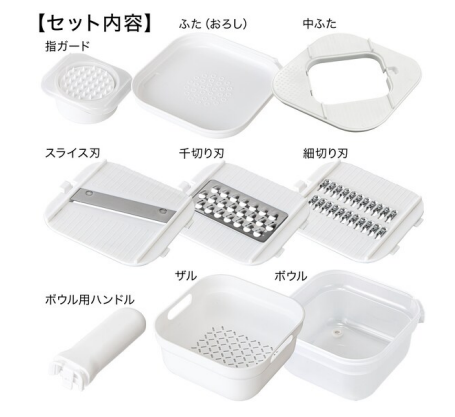 四⾓くコンパクトな形状に部品がまとまるので、収納も容易だ。スライス刃・千切り刃・細切り刃がボウルにぴったりサイズなので、スライス中に⾷材が⾶び散らないのもポイント。