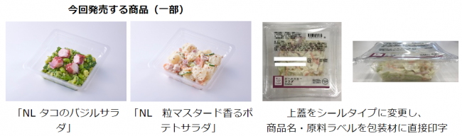 今回発売するサラダの容器は、上蓋をシールタイプに変更することで、蓋と補助テープ部分のプラスチック使用量を削減することができ、CO2排出量の削減にもつなげる。また、これまで紙製の商品名、原料名を包装材に直接印刷する技術を導入することでラベルの削減につなげる。