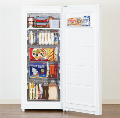 今回発売した冷凍庫は買い物かご約4個分を冷凍できる⼤容量なので、⼀度にまとめ買いをしたい時やたくさんの⾷品や、作り置き・下ごしらえしたものを冷凍保存できるため、買い物の回数も減らせて節約にも役立つ。