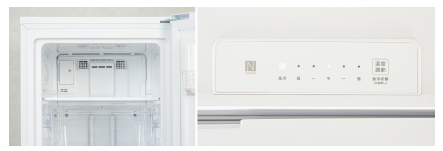 扉にはポケットがついていて、すぐに取り出したい冷凍⾷品を置けて便利。また、ファン式タイプで⾃動霜取り機能付き。冷気を全体にムラなく広げ⾃動で霜取りを⾏うので⼿⼊れが簡単。操作パネルで庫内の温度調整が3段階(弱・中・強)に設定できる。温度調整の他、急凍モードが選べて、庫内温度を-32℃に設定することで素早く冷凍が可能。鮮度保持がおいしさが⻑く続く。