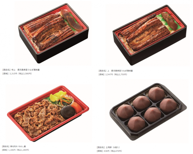 「上 鹿児島県産うなぎ蒲焼重」(2750円) の重弁当などのうなぎ商品4種、「黒毛和牛 牛めし重」(1280円) 、「土用餅」(470円)などのサイドメニュー3種の全7品目がラインアップされている。