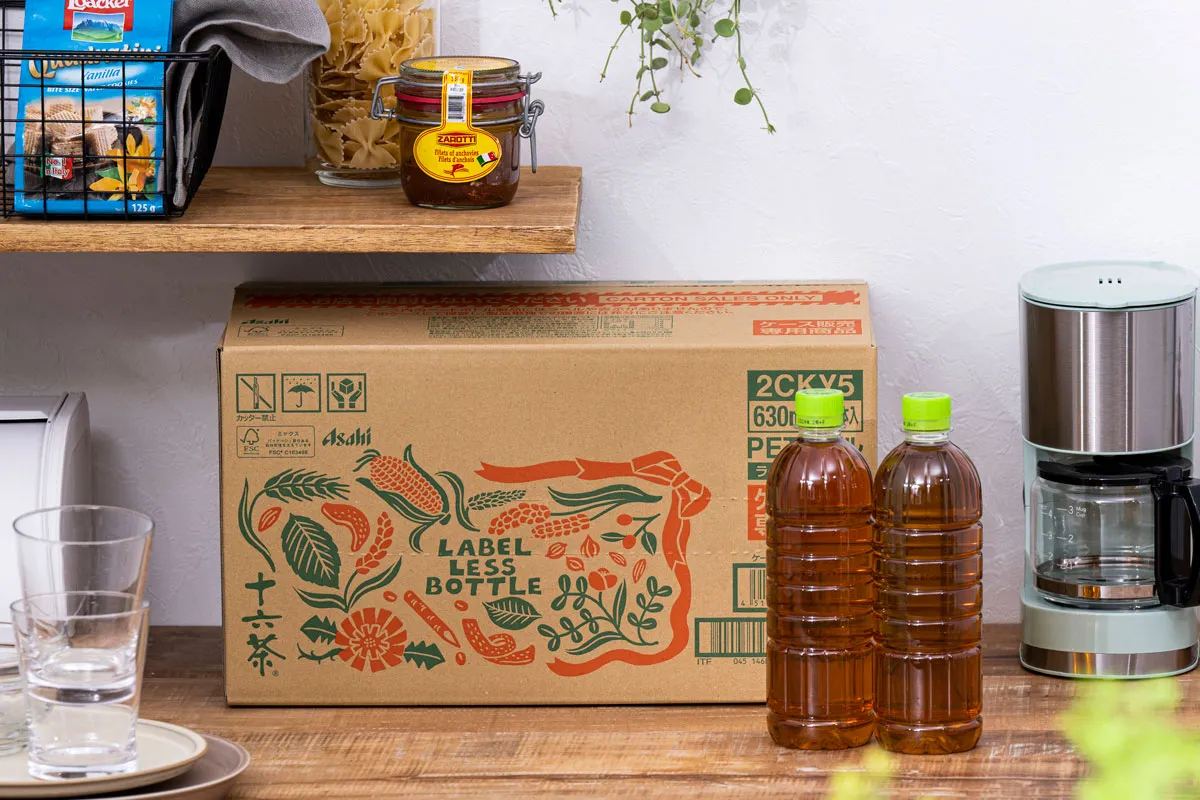 からだにやさしい十六素材と環境にやさしいラベルレスを表現した「リボン」がコンセプトの限定デザイン。カートンのデザインはオシャレでかわいいので、キッチンやリビングにそのままストックしても、目立つことなく空間に自然に溶け込む。630ml入りで1880円。協賛はアサヒ飲料(株)。