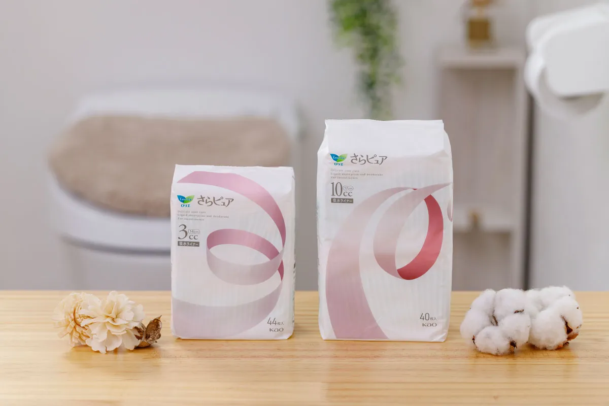 女性に寄り添った発想で、そのまま置いておけるデザインにした。パッケージのリボンは躍動感のあるデザインにし、吸収量を表す数字の3を表現している。裏返してそのまま置いておけるように、裏面の文字情報はすべて取り除いた。3ccが298円 / 10ccが398円。協賛は花王グループカスタマーマーケティング。