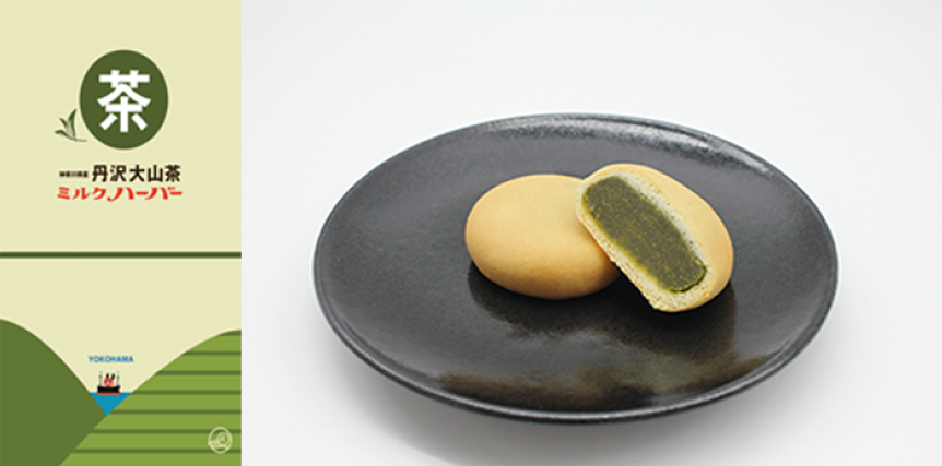 練乳とはちみつを使用したしっとりした生地に、特製の白餡を包んだ洋菓子「ミルクハーバー」に、神奈川県産のお茶「丹沢大山茶」をたっぷり練り込んだ。価格は1個/160円(税込み、以下同じ)、5個/800円(化粧箱入り)。販売数量は1個売りが2340個、5個売りが5000箱の予定。