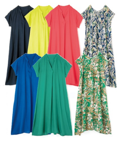 「N+ サンドレスコレクション」はレーヨン素材で、1枚でさらっと着られるワンピースを毎年リニューアルしながら販売している。ポケット付きレーヨンスキッパーワンピース2490円とプリントレーヨンフレンチスリーブワンピース2990円がある。今シーズンは、⾊や柄、形をアップデートし、全7アイテムを展開中だ。