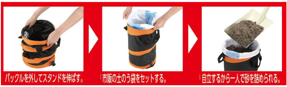コメリnews|ごみ箱にもなる災害時の「土のう袋用スプリングスタンド」