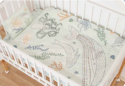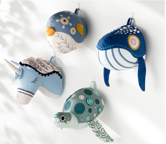 「海の仲間たちが、やさしく⾒守る。」をテーマに、海をモチーフにした⼿縫い刺繍が特徴の寝具セットとフリーケット、かわいい動物の⽴体的なウォールデコレーションをラインアップした。