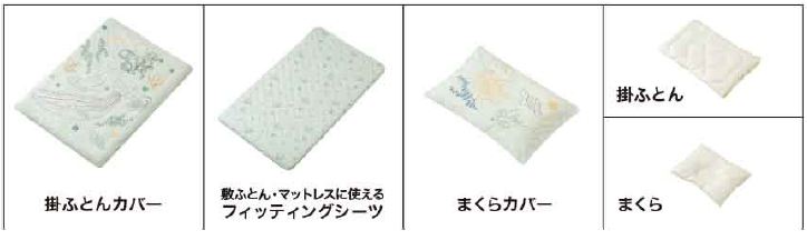 ベビー寝具セットは、掛ふとんカバー・フィッティングシーツ・まくらカバー・掛ふとん・まくらの5点で1万7900円(税込み、以下同じ)。