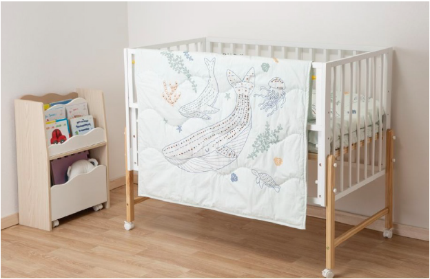 ⼿縫いの刺繍をアクセントにあしらった掛け布団カバーやまくらカバーが⼊った、ベビー寝具セット。⼀⽇の⼤半を寝て過ごす⾚ちゃんが休む空間を素敵に彩ってもらいたいという想いから開発した。上品で華やかなため、出産祝いなどのプレゼントとしてもおすすめ。