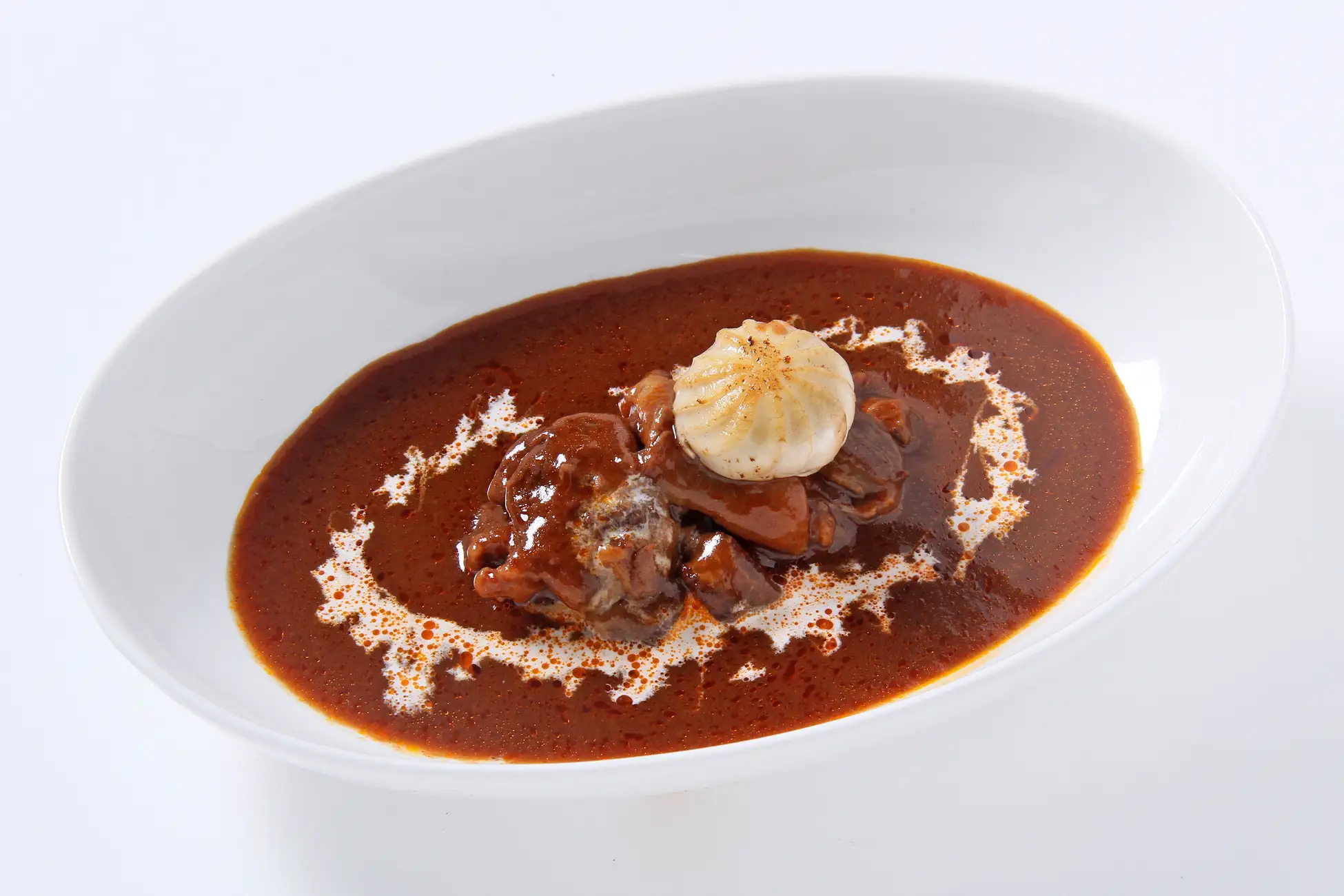国産牛のすね肉をシェフ特製のデミグラスシチューで柔らかく煮込んだ。好みでパスタを絡めてもおいしい。価格は734円。