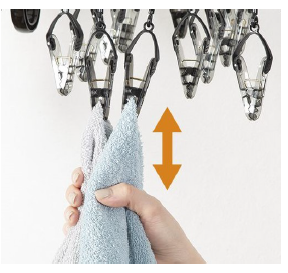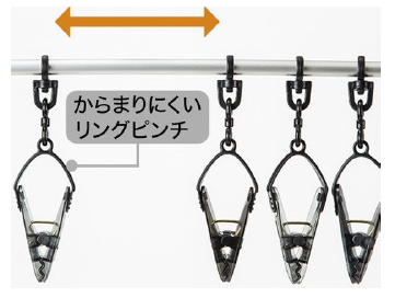 ⑤洗濯物の形に合わせてピンチの移動ができ、ピンチを無駄にせず効率よく⼲せる。また、リング式のピンチなので、ピンチ同⼠が絡むストレスも解消できる。