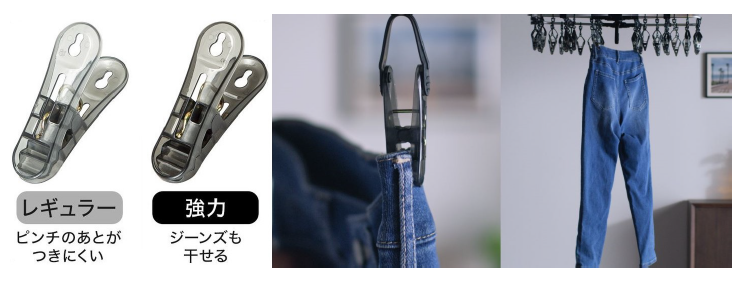④洗濯物の重さで⼲し分けできる2種類のピンチを採用した。強ピンチは、ジーンズなどの重い洗濯物も⼲せる。