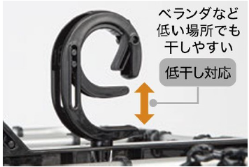 ⑦ベランダなど低い場所でも⼲しやすいフック。掛け式ロック付きのため、⾵の⽇も安⼼だ。