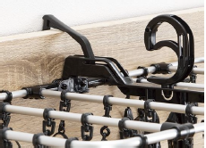 ⑧グリップが収納フックを兼ねているのでコンパクトに収納できる。補助ハンドル付きで、⾼い位置でも掛けやすい。