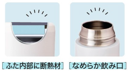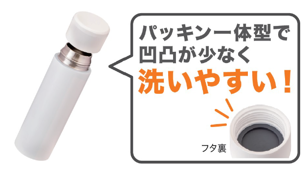 特徴の3点目がフタ内部に断熱材を⼊れて保温効⼒をアップさせたこと。ボトル本体も真空断熱⼆重構造のため、保温/保冷効果が⻑持ちする。