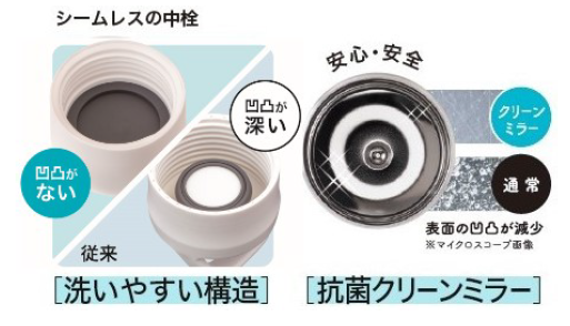 第2にフタ内部の構造を⾒直したこと。凹凸をなくしたことでスポンジが届きにくいすき間がなくなり、洗いやすくなった。内⾯には抗菌クリーンミラー加⼯を施し、臭いや汚れが付きにくくなった。