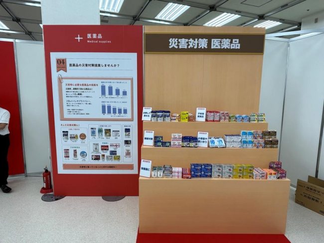 また、ライフラインとしての小売店舗の役割を意識して、災害対策コーナーも提案された。水無しで飲める薬、空腹時にも飲める薬などの売場展開例が設けられた。