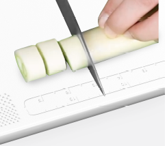 ⾷材を均等に切るのに便利な⽬盛り付き。