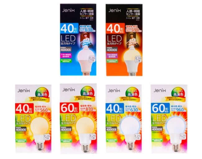価格は「Jenix センサーLED電球 40形相当 E26 昼光色」「Jenix センサーLED電球 40形相当 E26 電球色」が898円(税込み、以下同じ)、「Jenix センサーLED電球 60形相当 E26 昼光色」「Jenix センサーLED電球 60形相当 E26 電球色」が980円、「Jenix 高演色LED電球 40形相当 E26 昼光色」「Jenix 高演色LED電球 40形相当 E26 電球色」が498円、「Jenix 高演色LED電球 60形相当 E26 昼光色」「Jenix 高演色LED電球 60形相当 E26 電球色」が598円。