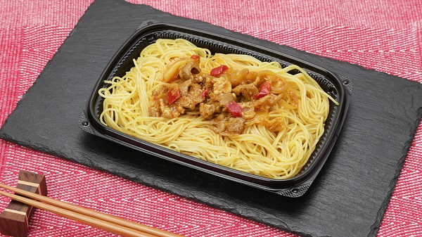 豚肉、キャベツ、玉ねぎ、レッドピーマンをトッピングしたカレー味の焼ビーフン。中華風調味料を加えてコク旨な辛さに仕上げた。価格は268円。