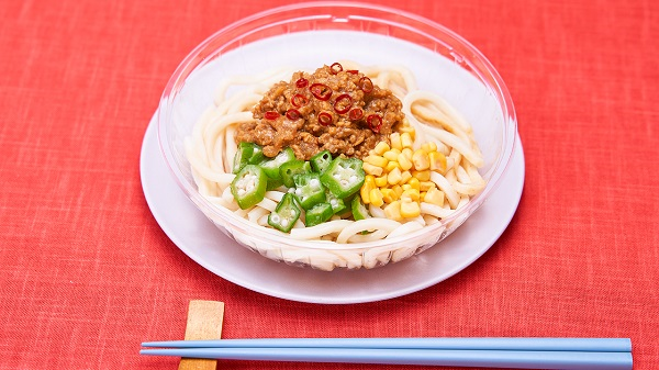 冷しうどんにキーマカレーと夏野菜をトッピングした、夏ならではのうどん。キーマカレーはうどんと麺つゆに合うように独自開発した。刻んだオクラや揚げ玉が意外にもよくマッチする。価格は376円。
