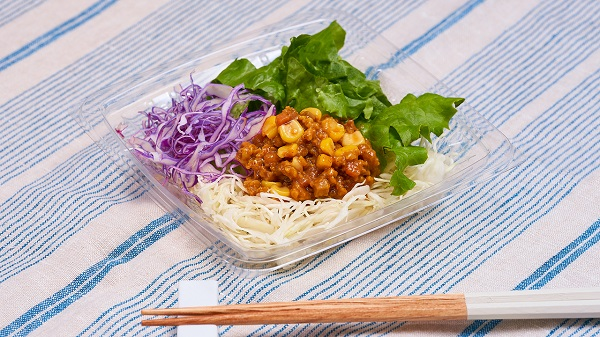 ドレッシングの代わりにスパイシーなキーマカレーソースで食べる野菜サラダ。ご飯にのせれば、ちょっとしたキーマカレー丼に変身する。メインの副菜としても使える。価格は214円。